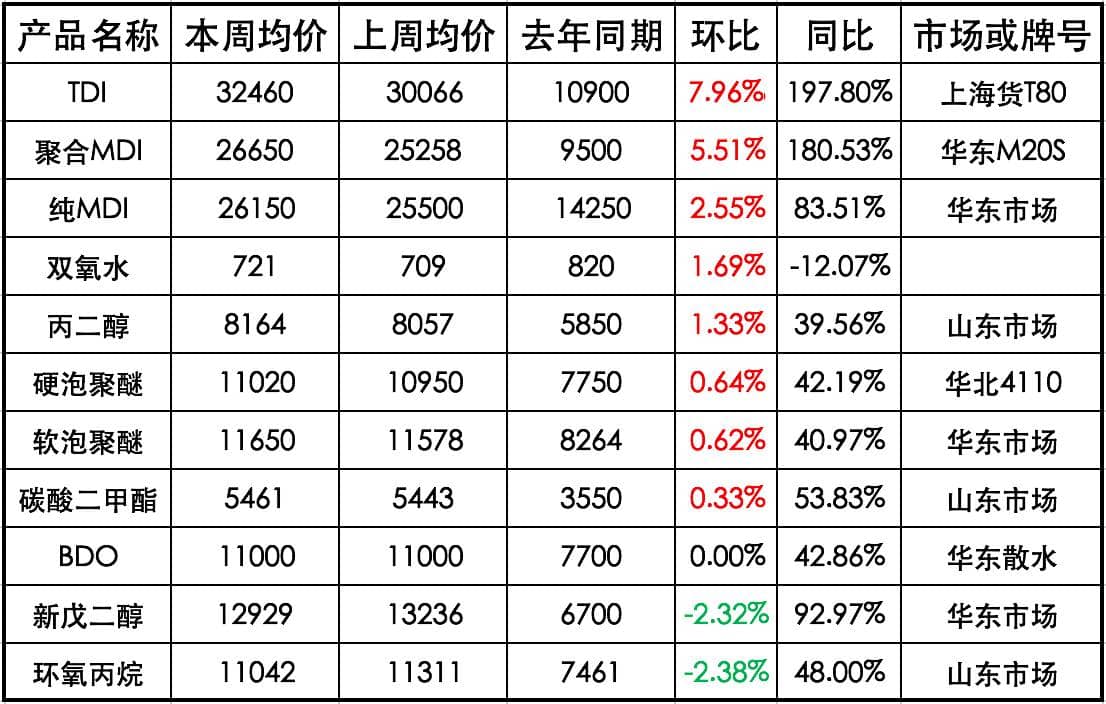 聚氨酯產(chǎn)業(yè)鏈相關(guān)產(chǎn)品周度價(jià)格表