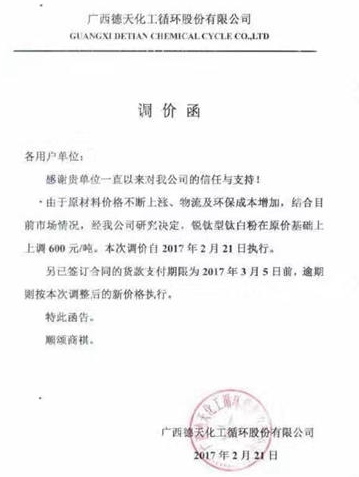 廣西德天化工循環(huán)股份有限公司決定在2017年2月21日因材料價格上漲影響,銳鈦型鈦白粉在原價格基礎上上調600元/噸。
