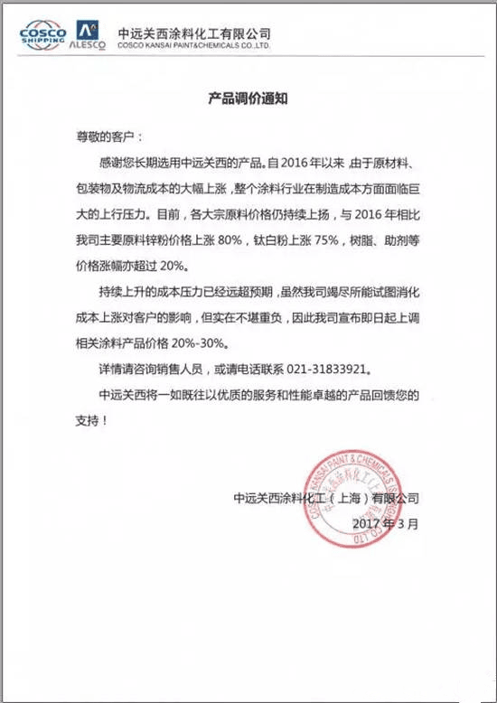 關于中遠關西涂料宣布上調(diào)