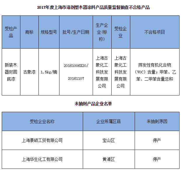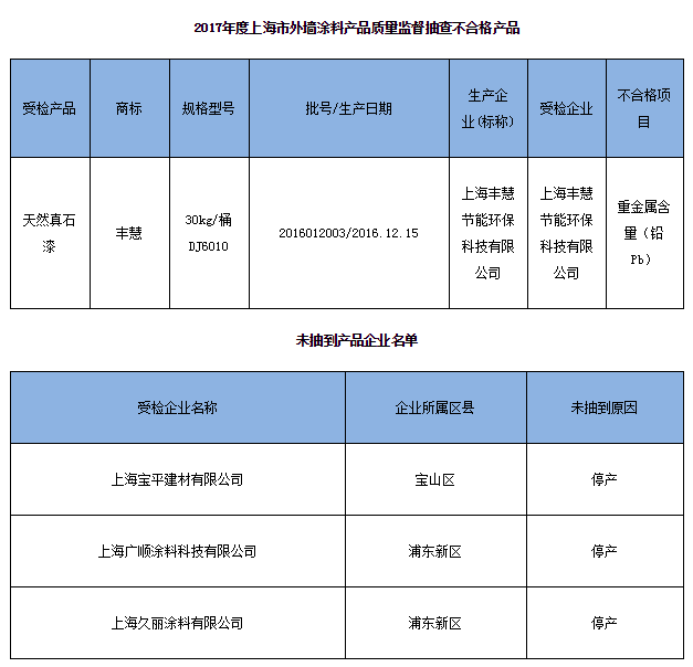 本次抽查發(fā)現(xiàn),上海古象化工科技發(fā)展有限公司生產(chǎn) (標(biāo)稱)的1批次“古象漆”新裝木器封固底漆(1.5kg/桶 20161006X20/ 20161107)不合格,涉及的不合格項(xiàng)目為揮發(fā)性有機(jī)化合物(VOC)含量和甲苯、乙苯、二甲苯含量總和。據(jù)本次發(fā)布的《2017年度上海市外墻涂料產(chǎn)品質(zhì)量監(jiān)督抽查不合格產(chǎn)品》名單,上海豐慧節(jié)能環(huán)??萍加邢薰旧a(chǎn) (標(biāo)稱)的1批次“豐慧”天然真石漆(規(guī)格型號(hào):30kg/桶 DJ6010 ;批號(hào)/生產(chǎn)日期:2016012003/2016.12.15)不合格,涉及的不合格項(xiàng)目為重金屬含量(鉛Pb)。