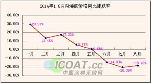 【中國(guó)涂料采購(gòu)網(wǎng)】目前建筑涂料在整個(gè)涂料市場(chǎng)占主導(dǎo)地位,有數(shù)據(jù)顯示建筑涂料約占行業(yè)產(chǎn)量的48%左右,大部分涂料企業(yè)都會(huì)涉足建筑涂料領(lǐng)域,作為建筑涂料用料之一的丙烯酸其市場(chǎng)行情也倍受涂料行業(yè)關(guān)注,因此我們對(duì)2014年1~8月市場(chǎng)價(jià)格走勢(shì)及未來發(fā)展趨勢(shì)做詳細(xì)的分析。
