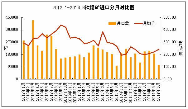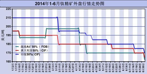 價(jià)格的發(fā)展往往受到下游市場需求及上游原材料價(jià)格走勢(shì)來決定的。自2011年下半年以來,國內(nèi)鈦白粉市場價(jià)格處于低位運(yùn)行狀態(tài),對(duì)國內(nèi)鈦精礦產(chǎn)品的價(jià)格也造成了很大的影響。從下圖我們可以看出,自2014年以來,全球鈦精礦市場價(jià)格出現(xiàn)下滑,以越南為例,從2014年1月份200美元/噸下滑到6月30日的167美元/噸左右,每噸下滑近30美元。