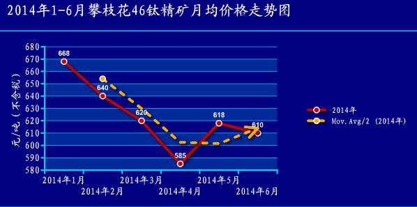 2014年上半年國際鈦精礦市場價(jià)格的下滑,影響了國內(nèi)鈦精礦市場價(jià)格的走勢(shì),據(jù)中國涂料采購網(wǎng)了解,自2014年1月至2014年4月,國內(nèi)鈦精礦市場價(jià)格出現(xiàn)大幅跳水,以攀枝花46鈦精礦為例,從下圖我們可以看出,國內(nèi)攀枝花46鈦精礦市場價(jià)格從1月668元/噸(不含稅)降至4月份的585元/噸,下滑幅度達(dá)83元/噸。5月份國內(nèi)鈦精礦市場價(jià)格迎來一次小漲,調(diào)漲至618元/噸,上漲33元/噸,較2014年1月份,仍處于下滑態(tài)勢(shì)。