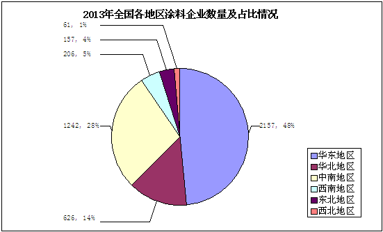 從上圖可以看出,華東地區(qū)2013年共有涂料生產(chǎn)企業(yè)2157家,占全國涂料生產(chǎn)企業(yè)的48%;華北地區(qū)2013年共有涂料生產(chǎn)企業(yè)626家,占全國涂料生產(chǎn)企業(yè)的14%;中南地區(qū)2013年共有涂料生產(chǎn)企業(yè)1242家,占全國涂料生產(chǎn)企業(yè)的28%;西南地區(qū)2013年共有涂料生產(chǎn)企業(yè)206家,占全國涂料生產(chǎn)企業(yè)的5%;東北地區(qū)2013年共有涂料生產(chǎn)企業(yè)157家,占全國涂料生產(chǎn)企業(yè)的4%;西北地區(qū)2013年共有涂料生產(chǎn)企業(yè)61家,占全國涂料生產(chǎn)企業(yè)的1%。