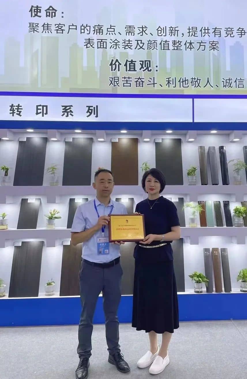 涂料采購網張馨元(右)為浙江興順楊總(左)頒發(fā)2022年粉末涂料百強獎牌