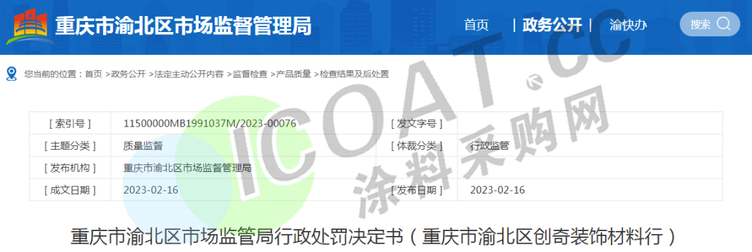 重慶市市場監(jiān)督管理局“重慶市渝北區(qū)創(chuàng)奇裝飾材料行”銷售的防水涂料進(jìn)行質(zhì)量監(jiān)督抽查。經(jīng)抽樣檢驗,斷裂伸長率(無處理)、斷裂伸長率(加熱處理)不符合GB/T 23445-2009標(biāo)準(zhǔn),沒收不合格的防水涂料2桶,沒收違法所得260.00元,罰款540.00元。