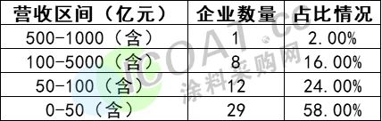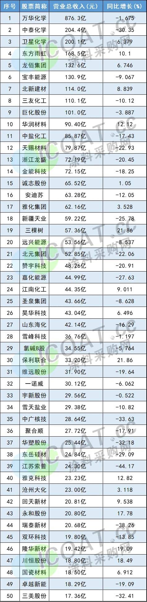 從營(yíng)業(yè)收入情況來(lái)看,國(guó)內(nèi)上市公司中,化工原料、化學(xué)制品等領(lǐng)域,營(yíng)收50強(qiáng)TOP1為萬(wàn)華化學(xué)(876.3億元),TOP2是中泰化學(xué),TOP3是衛(wèi)星化學(xué),而作為“涂料一哥”的東方雨虹和亞洲最大鈦白粉企業(yè)的龍佰集團(tuán),分別位列第四、第五位。