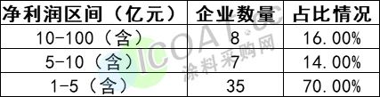 據(jù)不完全統(tǒng)計(jì),在凈利潤(rùn)50強(qiáng)中,在10億-100億(含)區(qū)間的有8家企業(yè),占比16%;5-10億(含)的企業(yè)有7家,占比高達(dá)14%;1-5億(含)的企業(yè)有35家,占比高達(dá)70%。化工行業(yè)50強(qiáng)2023年上半年凈利潤(rùn)普遍在5億(含)以下,高達(dá)7成,本次凈利TOP50強(qiáng)上榜門(mén)檻為1.14億元。