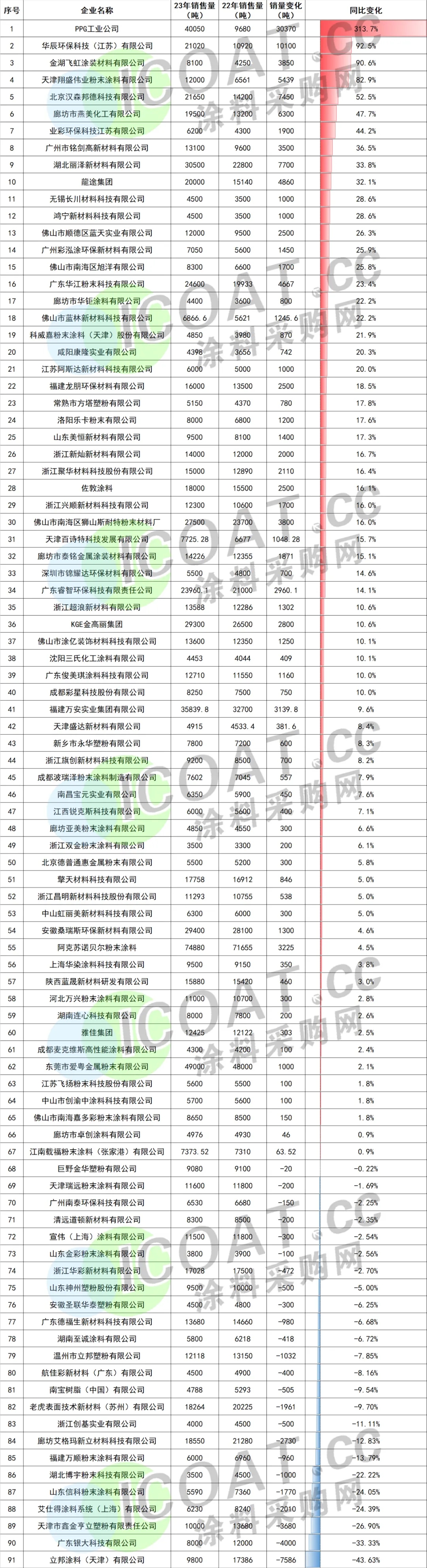 2023年粉末涂料百強(qiáng)企業(yè)銷量同比變動(dòng)榜