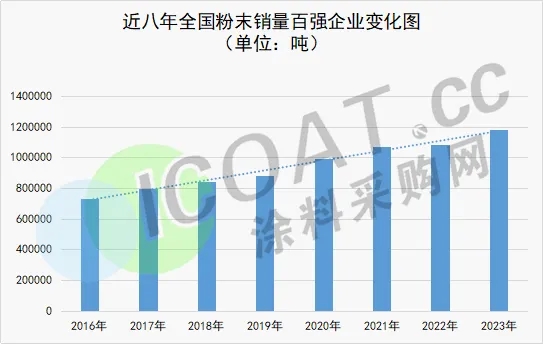 據(jù)涂料采購網(wǎng)數(shù)據(jù),2023年粉末涂料百強(qiáng)企業(yè)銷售量共1181847.3噸,同比2022年增長8.98%。