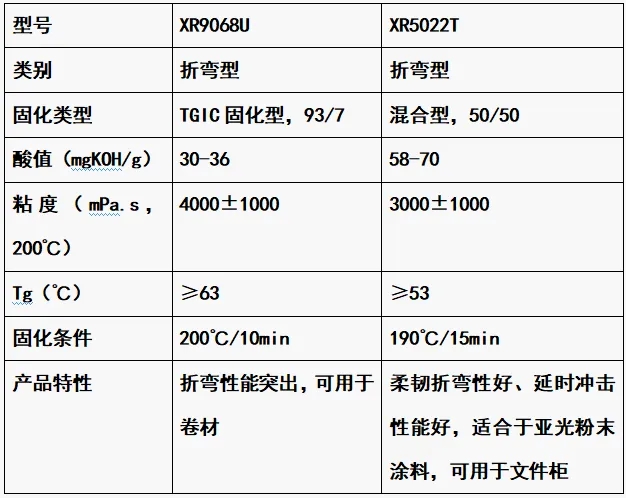 XR9068U折彎型樹脂是一種反應(yīng)活性較快的樹脂,粘度適中,Tg較高,分子鏈比較柔性,具有優(yōu)良的耐候、良好的機械性能以及極佳的柔韌性,已規(guī)模用于卷材涂料;XR5022T延時折彎型樹脂的反應(yīng)活性適中,粘度適中,分子鏈比較柔性,分子量比較大,具有良好的消光效果。該產(chǎn)品柔韌折彎性好、延時沖擊性能好,適合于亞光粉末涂料,板面細膩度好。