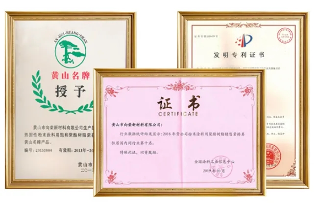 向榮新材料擁有XR系列聚酯樹脂100多個品種,產(chǎn)品遠銷國內(nèi)各大中城市,是國內(nèi)各知名粉末涂料制造企業(yè)的優(yōu)質(zhì)供應(yīng)商。企業(yè)是國家高新技術(shù)企業(yè)、國家專精特新小巨人企業(yè)、安徽省企業(yè)技術(shù)中心;擁有授權(quán)專利37項(發(fā)明專利17項、實用新型專利20項)、安徽省新產(chǎn)品5項、省市科技進步獎各1項,省市級科技創(chuàng)新成果和榮譽11項,獲得“安徽省著名商標(biāo)”、“安徽名牌產(chǎn)品”等稱號。