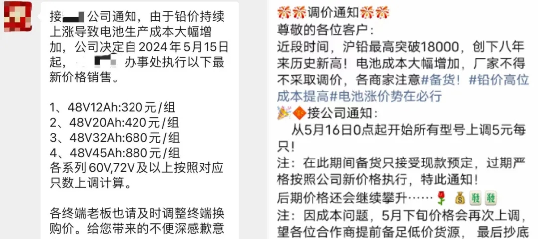 某電池品牌表示,從2024年5月15日起,48/12按照320元/組、48/20按照420元/組、48/32按照680元/組、48/45按照880元/組的價格執(zhí)行,各系列60V、72V及以上按照對應只數上調計算;另有企業(yè)表示,5月16日開始,所有型號電池上調5元/只,另外由于成本因素,5月下旬價格會再次上調,建議電動車行業(yè)商家合理安排庫存。