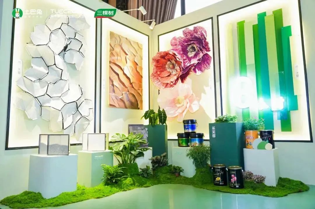 與此同時,以“國漆國色”打造夢幻色彩,三棵樹《墻面藝術廊》于大會品牌展示區(qū)特別展出,傳承東方之美,運用內(nèi)墻涂料、藝術漆、小森板、外墻涂料構筑“春”“夏”“秋”“冬”四季藝術空間,讓現(xiàn)場觀眾沉浸式感受產(chǎn)品藝術氛圍和色彩美學,與藝術對話,引領美好生活需求再次革命。