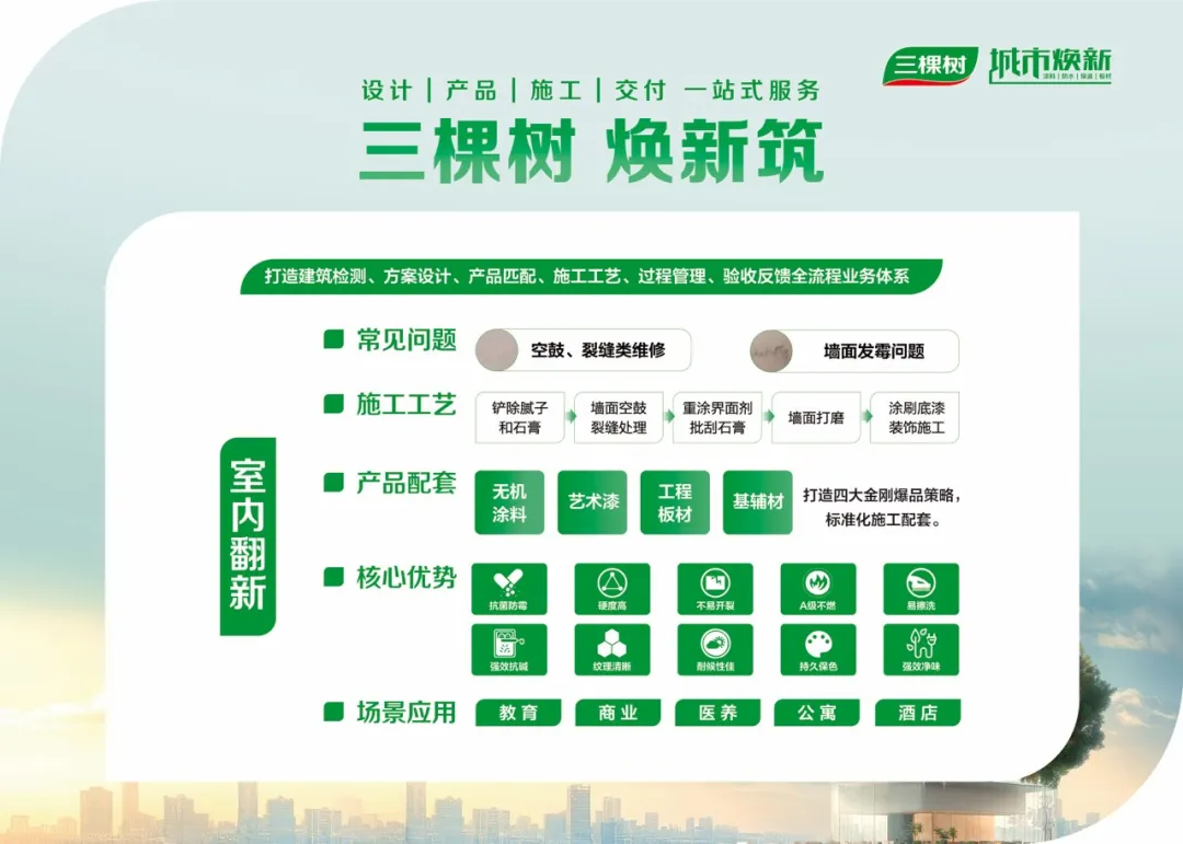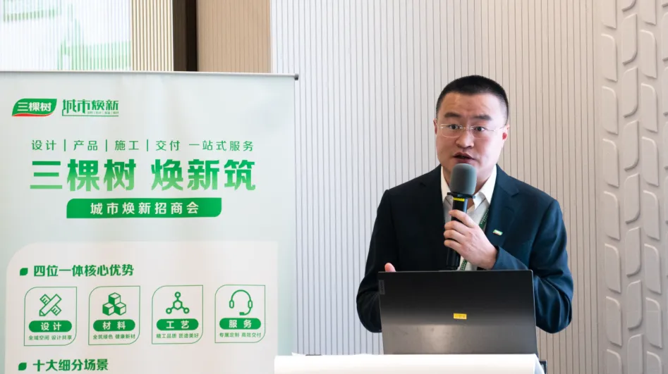 隨后,三棵樹(shù)城市煥新戰(zhàn)略部總監(jiān)兼售前支持部總監(jiān)華政安介紹城市煥新業(yè)務(wù)戰(zhàn)略定位。三棵樹(shù)憑借二十余年深厚的行業(yè)積累,依托全域空間設(shè)計(jì)、全筑美學(xué)理念、綠色產(chǎn)品體系等多方面優(yōu)勢(shì),為城市煥新打造集設(shè)計(jì)、產(chǎn)品、施工、交付于一體的一站式服務(wù)。其中,以內(nèi)外墻無(wú)機(jī)涂料、工程藝術(shù)漆、工程板材,以及基輔材“四大金剛”產(chǎn)品為核心,構(gòu)筑了城市煥新十大場(chǎng)景解決方案,引領(lǐng)行業(yè)邁向更高層次的發(fā)展,全面煥新城市活力。
