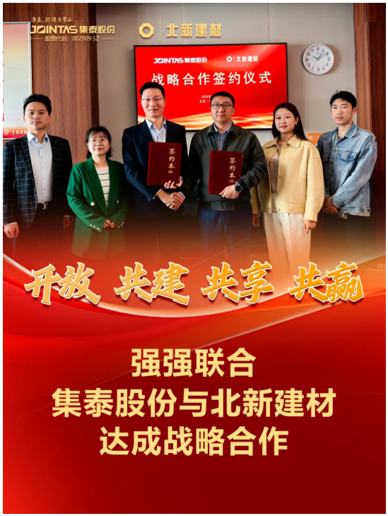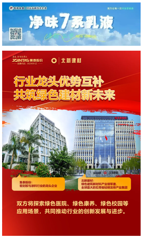 北新建材作為中國建材集團旗下的核心企業(yè),已成長為全球最大的石膏板輕鋼龍骨產(chǎn)業(yè)集團;集泰股份在密封膠、涂料領(lǐng)域具備深厚技術(shù)積累和豐富市場經(jīng)驗,是綠色建材行業(yè)的標桿企業(yè)。兩大龍頭的合作,標志著產(chǎn)業(yè)邁入?yún)f(xié)同發(fā)展階段,將加速低碳轉(zhuǎn)型進程。