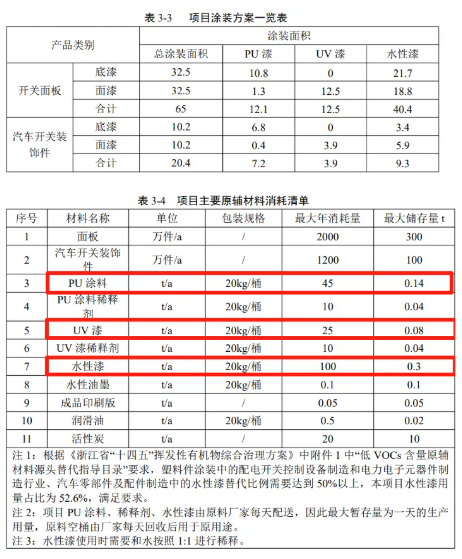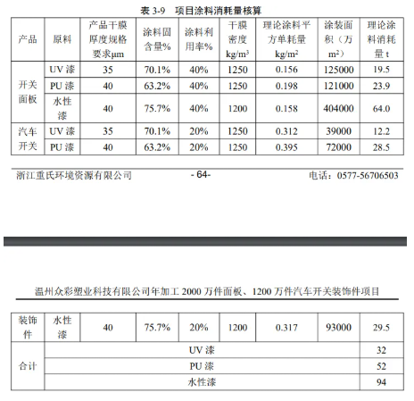 根據(jù)上表,項目理論計算溶劑漆、水性漆與企業(yè)提供的資料接近,本環(huán)評以 企業(yè)提供的涂料用量進行計算,即UV漆35t/a,PU漆55t/a,水性漆100t/a。