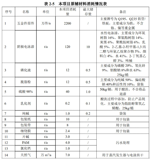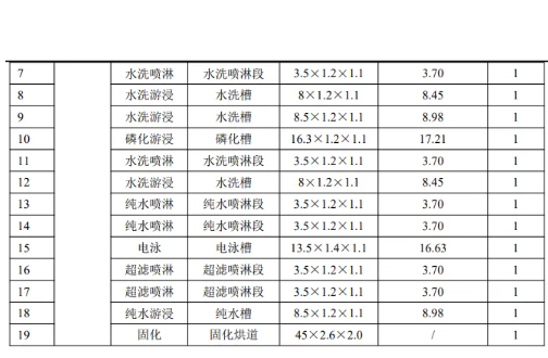 根據(jù)企業(yè)提供的資料,本項(xiàng)目電泳采用水性電泳漆,電泳漆固化后成膜厚度約0.1mm,干漆膜密度以1.25g/cm3計(jì)。電泳漆利用率以100%計(jì),則本項(xiàng)目所需電泳漆固體份用量為55t/a。根據(jù)業(yè)主提供的電泳漆MSDS 資料,電泳漆固含量約55%,則理論上需要電泳漆100t/a,本項(xiàng)目電泳漆總用量為120t/a,可以匹配實(shí)際需求。