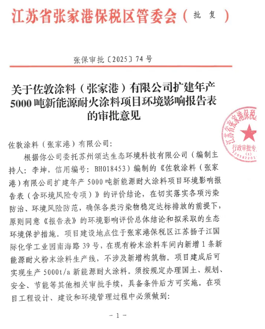 江蘇省張家港保稅區(qū)管委會(huì)批復(fù)稱(chēng):根據(jù)你公司委托蘇州頌達(dá)生態(tài)環(huán)境科技有限公司(編制主持人:李坤,信用編號(hào):BH018453)編制的《佐敦涂料(張家港)有限公司擴(kuò)建年產(chǎn)5000噸新能源耐火涂料項(xiàng)目環(huán)境影響報(bào)告表(含環(huán)境風(fēng)險(xiǎn)專(zhuān)項(xiàng))》的評(píng)價(jià)結(jié)論,在切實(shí)落實(shí)各項(xiàng)污染防治、環(huán)境風(fēng)險(xiǎn)防范,確保各類(lèi)污染物穩(wěn)定達(dá)標(biāo)排放的前提下原則同意《報(bào)告表》的環(huán)境影響評(píng)價(jià)總體結(jié)論和擬采取的生態(tài)環(huán)境保護(hù)措施。項(xiàng)目建設(shè)地點(diǎn)位于張家港保稅區(qū)江蘇揚(yáng)子江國(guó)際化學(xué)工業(yè)園南海路39號(hào),在現(xiàn)有粉末涂料車(chē)間內(nèi)新增1條新能源耐火粉末涂料生產(chǎn)線(xiàn),不涉及新增構(gòu)筑物。項(xiàng)目建成后可實(shí)現(xiàn)生產(chǎn)5000t/a新能源耐火涂料。須按規(guī)定辦理國(guó)土、規(guī)劃安全、節(jié)能等其他相關(guān)審批手續(xù),具備條件后方可實(shí)施。