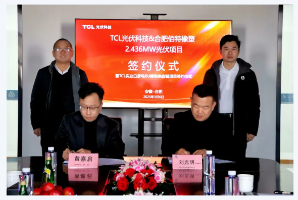 簽約儀式現(xiàn)場,TCL白家電BU供應鏈管理中心總監(jiān)彭軍、結構采購室副經理秦超、合肥佰特橡塑佰特總經理高偉、常務副總劉光明、TCL光伏科技渠道開發(fā)部總經理黃嘉啟等領導共同出席,作為TCL光伏科技首個落地的白家電供應鏈項目,具有重要的標桿意義,雙方的綠色能源項目將邁入新階段。