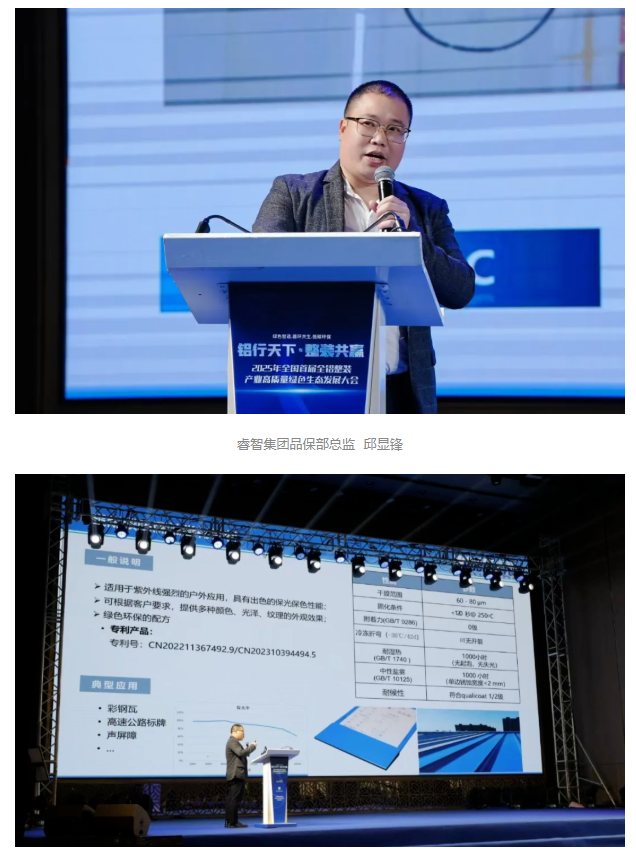 睿智集團(tuán)品保部總監(jiān)邱顯鋒以“粉末涂料助力全鋁整裝產(chǎn)業(yè)高質(zhì)量綠色發(fā)展”為主題,分享了睿智粉末涂料及睿智卷材粉末涂料在環(huán)保性、耐久性、色彩多樣性等方面的性能優(yōu)勢(shì),以及在全鋁整裝產(chǎn)業(yè)中的應(yīng)用實(shí)踐。