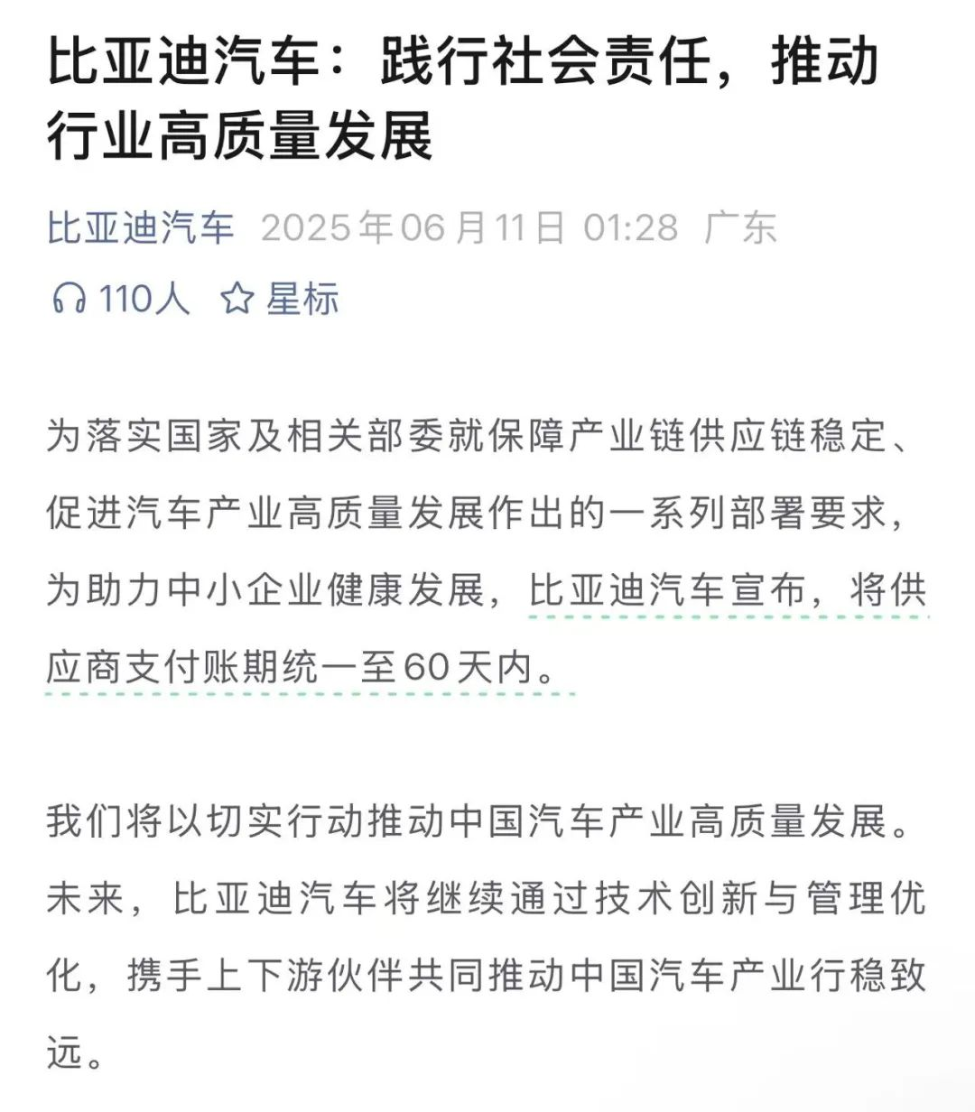 近日,比亞迪汽車官微重磅宣布,將供應(yīng)商支付賬期統(tǒng)一至60天內(nèi)。比亞迪表示,此舉是為落實(shí)國(guó)家及相關(guān)部委就保障產(chǎn)業(yè)鏈供應(yīng)鏈穩(wěn)定、促進(jìn)汽車產(chǎn)業(yè)高質(zhì)量發(fā)展作出的一系列部署要求。這份凌晨發(fā)布的消息,也為汽車行業(yè)開(kāi)啟了新的拐點(diǎn)。