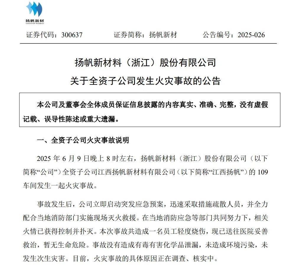 6月9日,揚(yáng)帆新材全資子公司江西揚(yáng)帆新材料有限公司的109車間發(fā)生火災(zāi)事故。本次事故共造成一名員工輕度燒傷。事故沒有造成有毒有害化學(xué)品泄漏,未造成環(huán)境污染,未發(fā)生次生災(zāi)害。