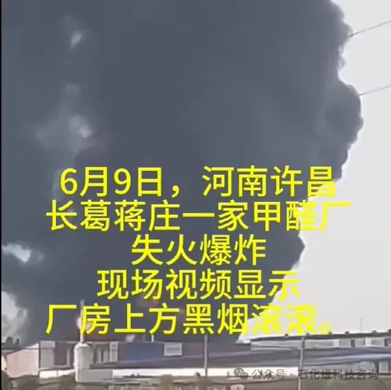 6月9日,河南許昌長(zhǎng)葛蔣莊一家甲醛廠發(fā)生失火并伴隨爆炸情況。事故未造成人員傷亡。