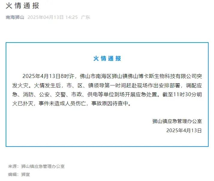 4月13日,佛山市南海區(qū)獅山鎮(zhèn)佛山博卡斯生物科技有限公司突發(fā)火災(zāi)。事件未造成人員傷亡,事故原因待查中。