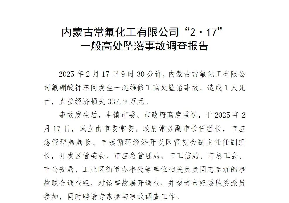 2月17日,內(nèi)蒙古常氟化工有限公司氟硼酸鉀車間發(fā)生一起維修工高處墜落事故,造成1人死亡,直接經(jīng)濟(jì)損失337.9萬元。