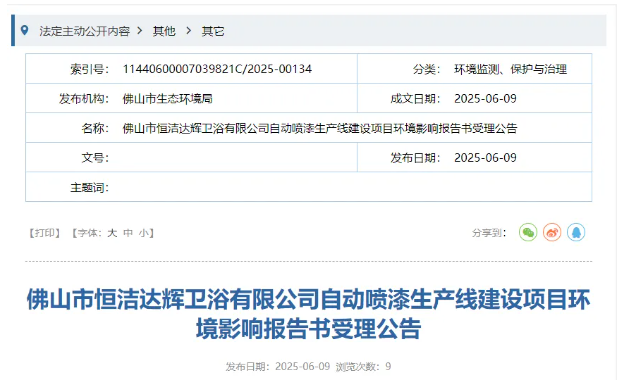 近日,佛山市生態(tài)環(huán)境局發(fā)布佛山市恒潔達輝衛(wèi)浴有限公司自動噴漆生產線建設項目環(huán)境影響報告書受理公告。