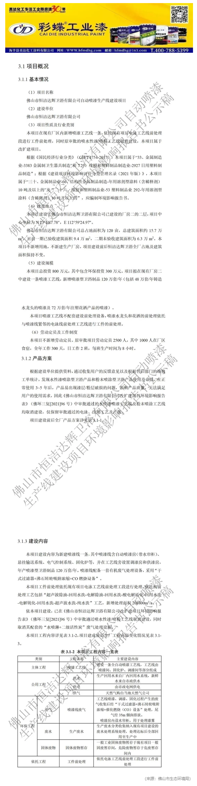 項目名稱:佛山市恒潔達輝衛(wèi)浴有限公司自動噴漆生產線建設項目