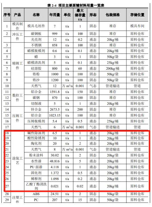 該項目涂裝車間新建一條表面處理線、一條噴粉固化線、一條噴漆固化線、移印機、絲印機,用于產(chǎn)品清洗、噴粉、噴漆、印刷生產(chǎn)。根據(jù)企業(yè)公開信息顯示,本項目年用粉末涂料30.02噸,年用水漆48.816噸,年用PU面漆4.118噸。