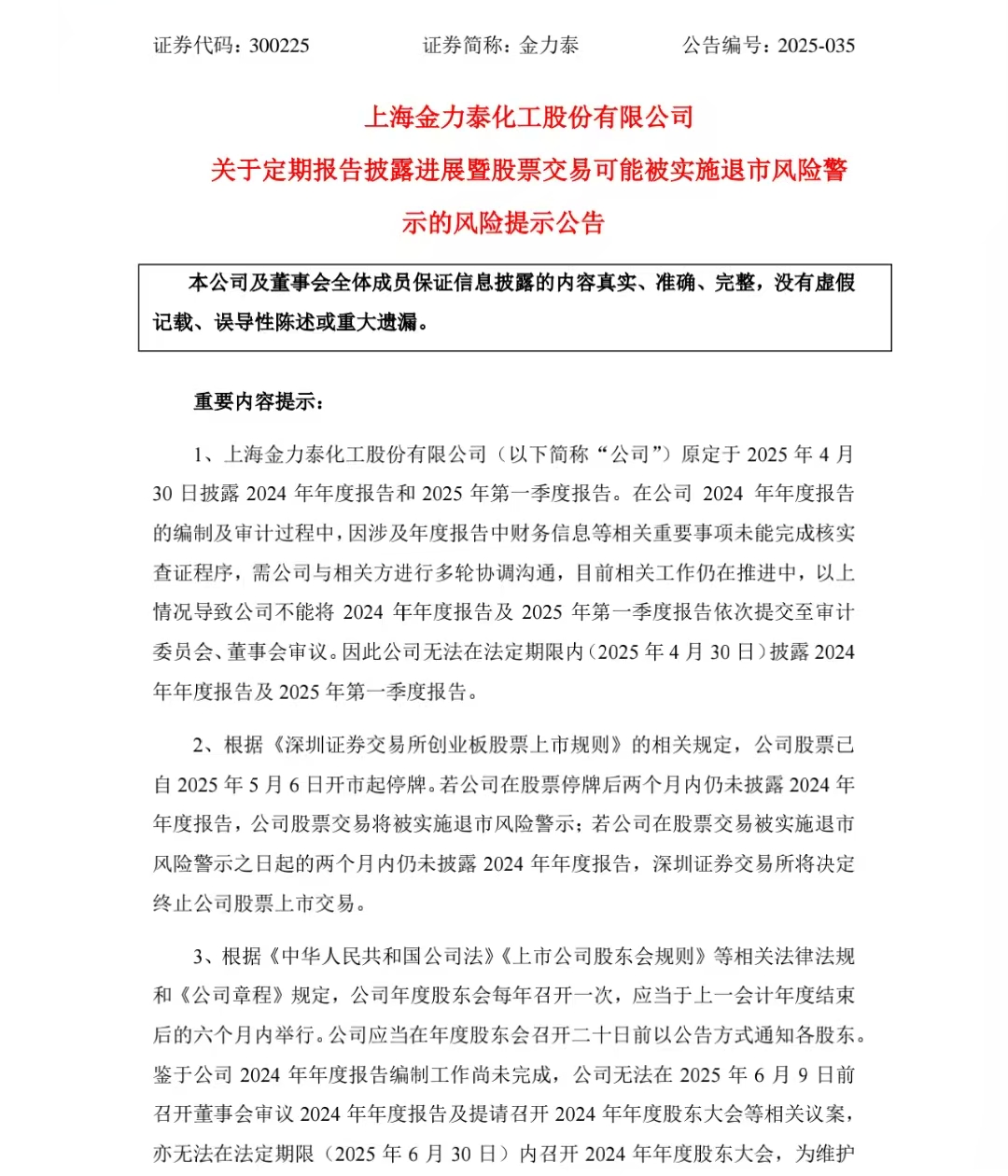近日,汽車涂料龍頭企業(yè)金力泰的一紙停牌公告,如同一記重錘,敲醒了涂料行業(yè)的從業(yè)者——因2024年年度報(bào)告及2025年第一季度報(bào)告無法按期披露,公司股票被迫停牌。若兩個(gè)月內(nèi)仍無法公布年報(bào),將被實(shí)施退市風(fēng)險(xiǎn)警示;再逾期,或?qū)⒚媾R終止上市的命運(yùn)。
