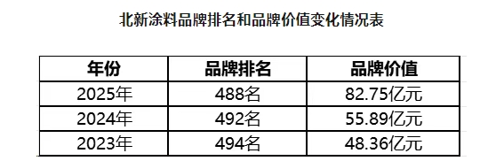 6月18日,由世界品牌實(shí)驗(yàn)室主辦的第22屆世界品牌大會(huì)在北京盛大舉行,會(huì)上權(quán)威發(fā)布了2025年《中國(guó)500最具價(jià)值品牌》排行榜。北新涂料再度榮耀上榜,以82.75億元的品牌價(jià)值位居第488位,品牌價(jià)值較上一年增加26.86億元,增幅高達(dá)48.06%,排名也較往年上升了4位。值得一提的是,這已是北新涂料連續(xù)第三年上榜,且品牌排名和品牌價(jià)值均實(shí)現(xiàn)了大幅跨越,書寫了涂料行業(yè)的品牌傳奇。