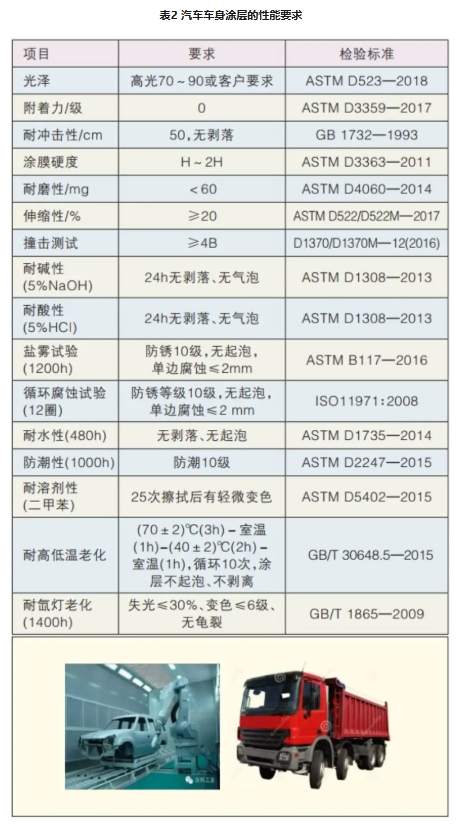 據(jù)報(bào)道阿克蘇諾貝爾生產(chǎn)的Interpon超耐候聚酯粉末色漆在佛羅里達(dá)曝曬60多個(gè)月后,保光率大于80%,并已為TOYOTA、HONDA、AUDI、PSA、FORD等汽車生產(chǎn)公司所采用,具有與傳統(tǒng)水性色漆涂料相類似的外觀,汽車車身粉末涂裝性能要求如表2所示。