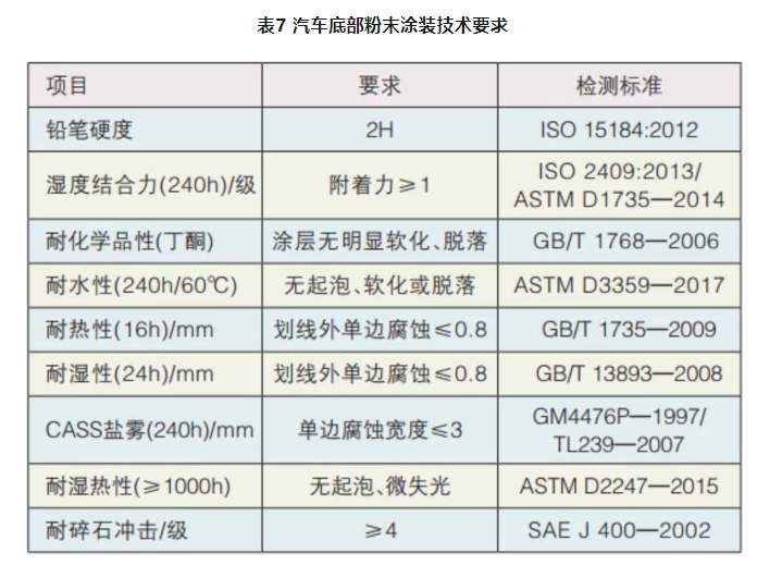 汽車底部涂裝主要選用環(huán)氧體系和聚氨酯體系。表7列出了汽車底部粉末涂裝技術(shù)要求。