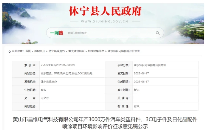 近日,休寧縣生態(tài)環(huán)境分局發(fā)布黃山市昌維電氣科技有限公司年產(chǎn)3000萬件汽車類塑料件、3C電子件及日化品配件噴涂項(xiàng)目環(huán)境影響評價(jià)征求意見稿公示。