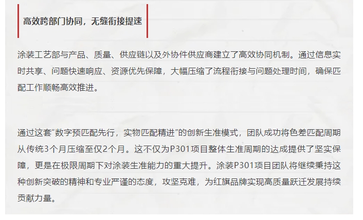 在紅旗品牌加速發(fā)展的關(guān)鍵時期,P301項目作為首個生準(zhǔn)周期壓縮至10個月以內(nèi)的標(biāo)桿性短周期項目,對各個環(huán)節(jié)提出了極致效率要求。作為涂裝生準(zhǔn)階段的核心環(huán)節(jié),色差匹配工作面臨前所未有的周期挑戰(zhàn)。P301項目團(tuán)隊打破常規(guī),創(chuàng)新采取數(shù)智化色差匹配、專業(yè)深度賦能、高效跨部門協(xié)同三大核心舉措,向傳統(tǒng)周期3個月發(fā)起挑戰(zhàn)。 (來源:一汽工程人涂裝工藝部)