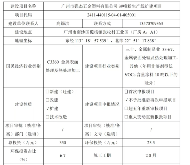 項目名稱:廣州市強杰五金塑料有限公司3#噴粉生產(chǎn)線擴建項目