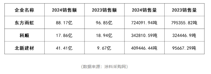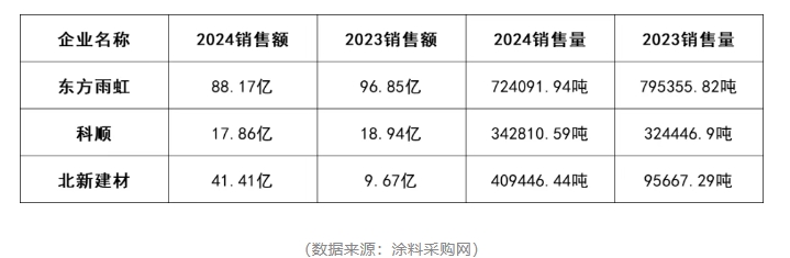 數(shù)據(jù)顯示,東方雨虹2024年銷售額88.17億,同比下降8.96%;銷售量72.41萬噸,同比下降8.96%。科順股份2024年表現(xiàn):銷售額17.86億,下降5.7%;銷售量34.28萬噸,增長(zhǎng)5.67%,銷量增但營(yíng)收降,反映價(jià)格競(jìng)爭(zhēng)加劇。由于2024年北新建材防水業(yè)務(wù)并表嘉寶莉,銷售額和銷售量同比大幅增長(zhǎng),但這一增長(zhǎng)主要來自并購(gòu)而非內(nèi)生增長(zhǎng),因此不具備行業(yè)可比性。