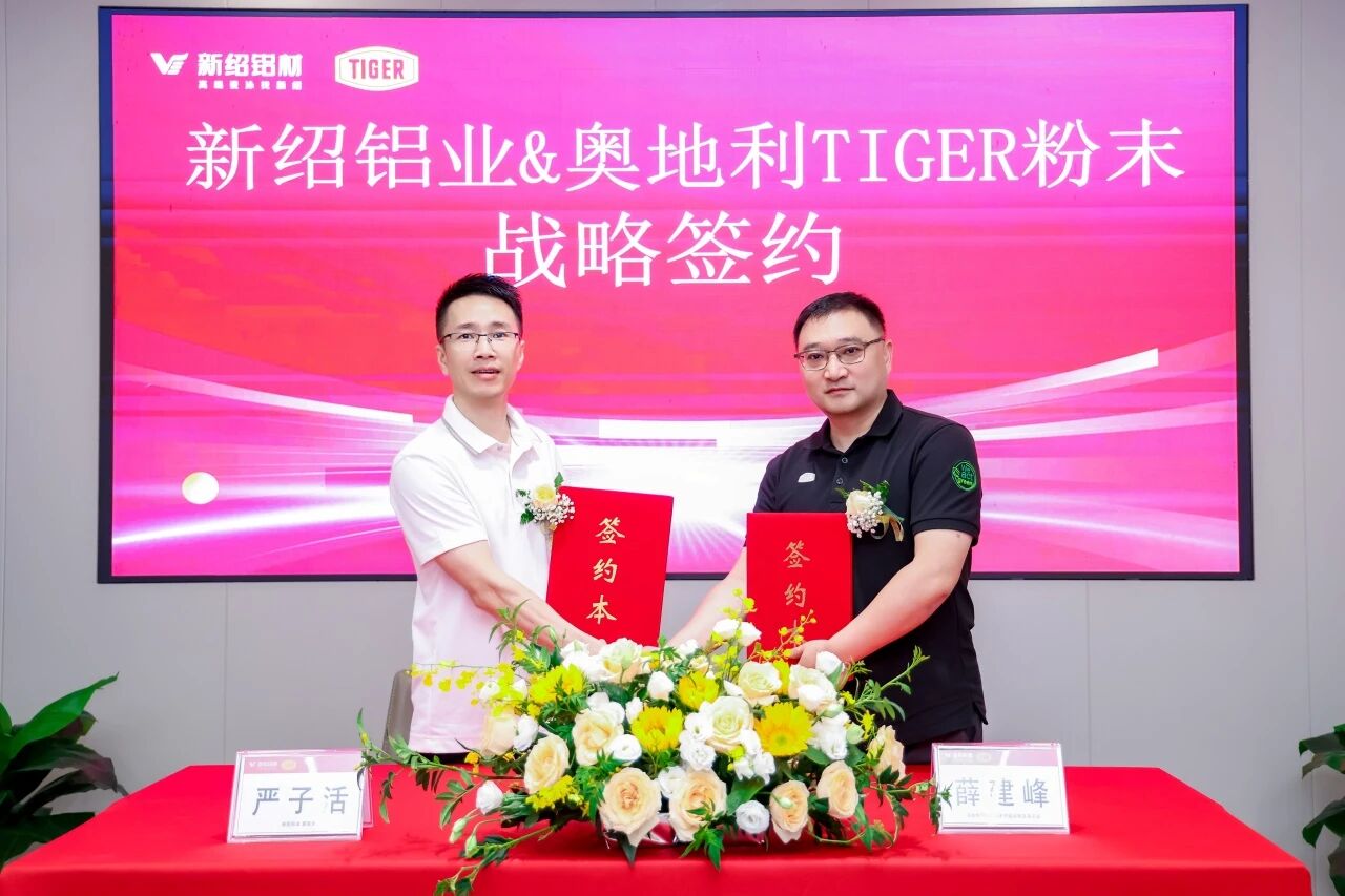 新紹鋁業(yè)董事長嚴子活、奧地利TIGER粉末中國區(qū)戰(zhàn)略業(yè)務總監(jiān)薛建峰共同簽約