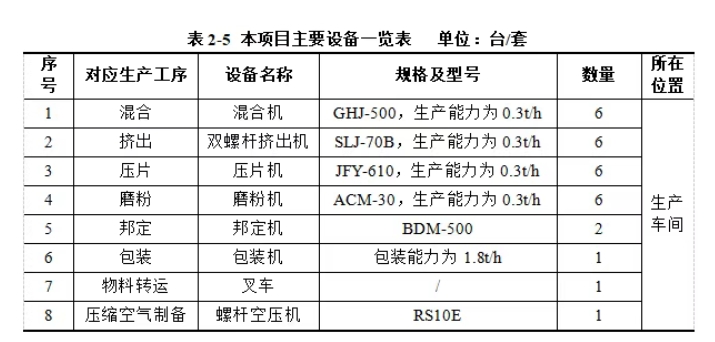 一期項(xiàng)目共設(shè)置6條生產(chǎn)線,每條生產(chǎn)線包括1臺(tái)混合機(jī)、1臺(tái)雙螺桿擠出機(jī)、1臺(tái)壓片機(jī)、1臺(tái)磨粉機(jī),每條線的生產(chǎn)能力為0.3t/h。項(xiàng)目產(chǎn)能為3600t/a,企業(yè)設(shè)計(jì)年工作時(shí)間為2400h,滿負(fù)荷工作可生產(chǎn)0.3*6*2400=4320t/a產(chǎn)品,滿足產(chǎn)能要求。本項(xiàng)目生產(chǎn)線工作時(shí)間為3600/0.3/6=2000h/a。