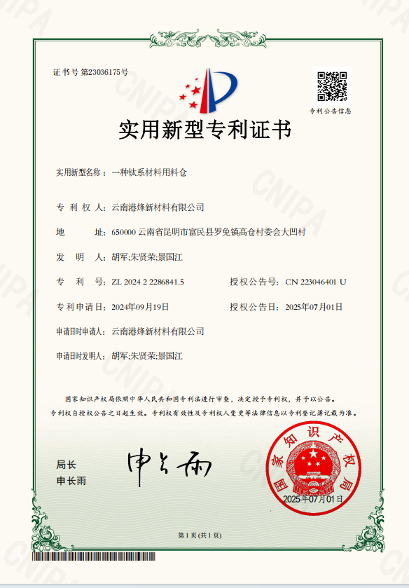 近日,泛華化學旗下全資子公司云南港烽新材料有限公司傳來喜訊,其提交的“一種鈦系材料用料倉”發(fā)明專利申請,成功獲得國家知識產(chǎn)權局授權(專利號:ZL202422286841.5 )。