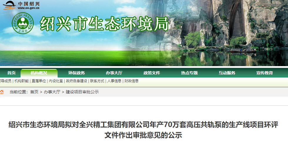 紹興市生態(tài)環(huán)境局發(fā)布擬對全興精工集團(tuán)有限公司年產(chǎn)70萬套高壓共軌泵的生產(chǎn)線項(xiàng)目環(huán)評文件作出審批意見的公示。
