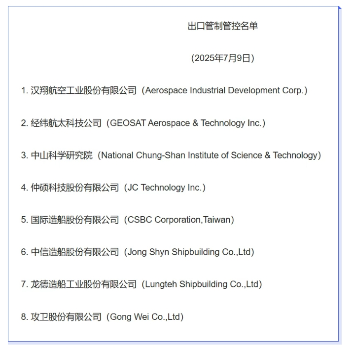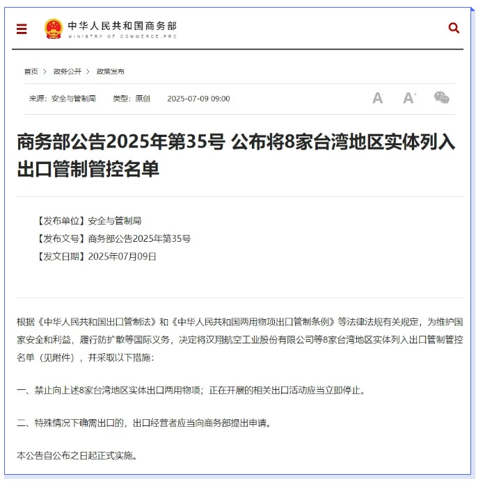 近日,商務部發(fā)布2025年第35號公告,決定將漢翔航空工業(yè)股份有限公司等8家臺灣地區(qū)實體列入出口管制管控名單。根據(jù)公告,禁止向上述8家實體出口兩用物項,正在開展的相關出口活動也應立即停止。