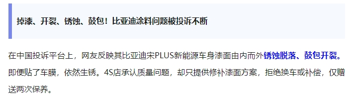 而據(jù)涂料采購網(wǎng)了解,在各類投訴平臺上,比亞迪確實因涂料問題被消費(fèi)者頻頻投訴,涉及掉漆、開裂、銹蝕等。這背后是一眾車主艱難的維權(quán),也揭開了這家民族車企“隱秘的角落”。
