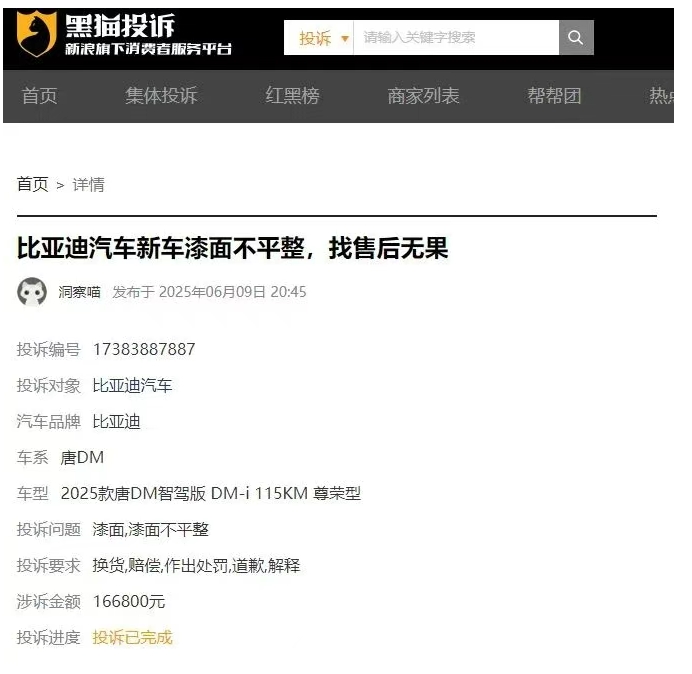 黑貓投訴平臺,有比亞迪2025款唐DM智駕版DM-i115KM尊榮型車主投訴漆面不平整,要求換貨、賠償?shù)?,涉訴金額166800元。