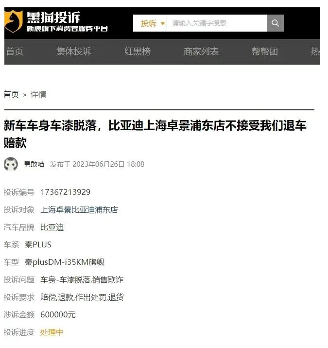 比亞迪秦PLUS DM-i35KM旗艦型車主稱車漆開裂,比亞迪拒不承認(rèn)是自身車漆問題,消費(fèi)者要求賠償、退款等,涉訴金額600000元。