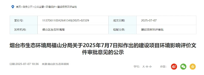 煙臺(tái)市生態(tài)環(huán)境局福山分局發(fā)布關(guān)于2025年7月7日擬作出的建設(shè)項(xiàng)目環(huán)境影響評(píng)價(jià)文件審批意見的公示。
